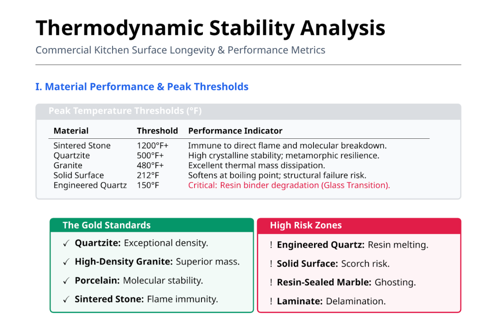 With commercial kitchen countertops, materials that manage heat through mass and structure consistently outperform those that rely solely on resin or surface integrity.