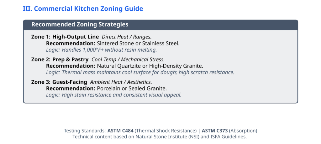 According to the NSI, granite countertops continue to be a reliable choice in commercial kitchens because they manage heat through mass, not coatings or binders.